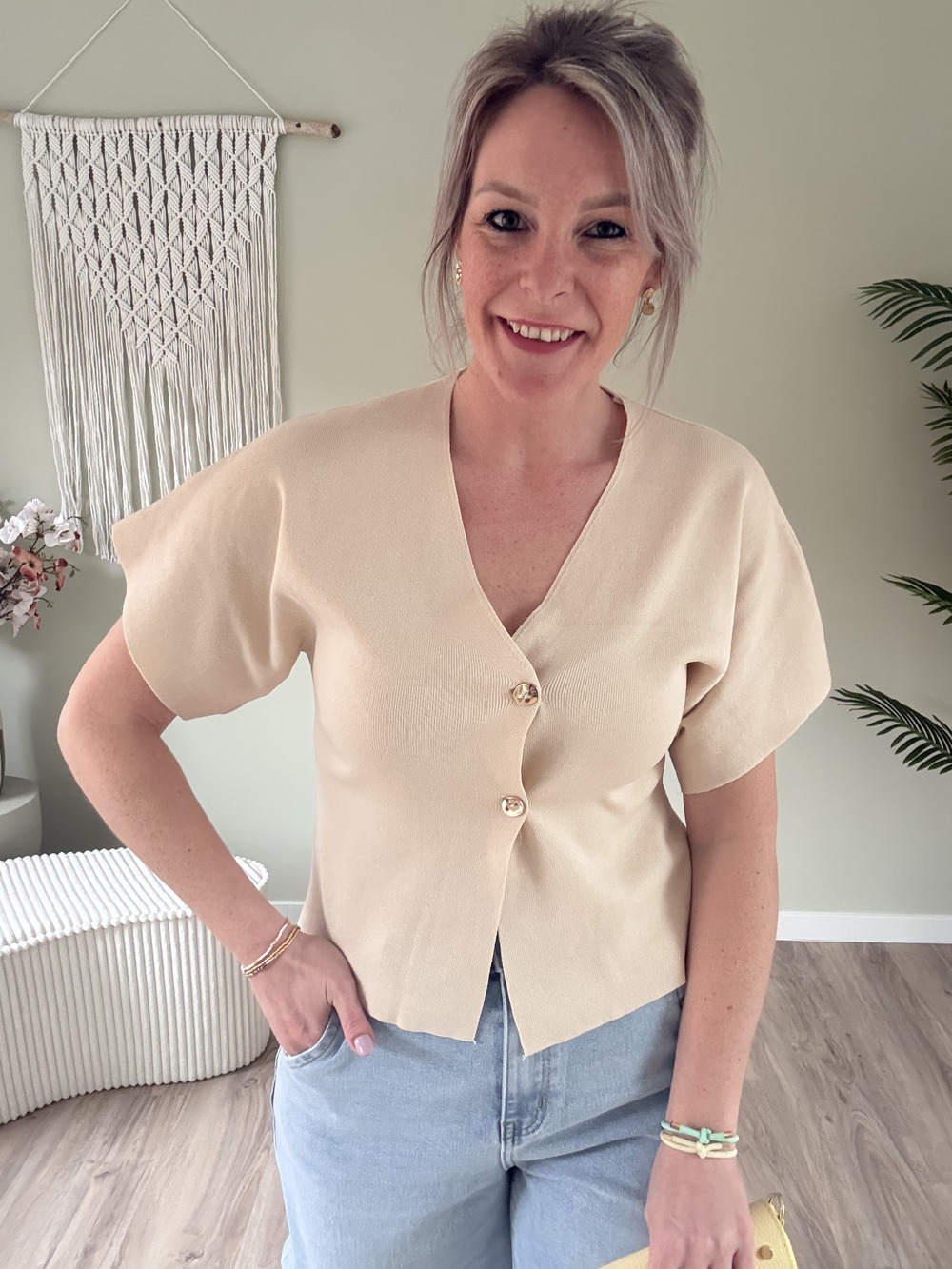 Deze mooie top komt het best tot zijn recht wanneer je hem dicht draagt. De top heeft een asymmetrische pasvorm in het midden, waardoor hij ook heel chique oogt. Deze top kan dus ook heel goed naar een feestje gecombineerd met je favoriete pantalon. Voorzien van 2 gouden knopen en een wijde mouw. Verkrijgbaar in de maten SM en ML, valt iets kleiner.