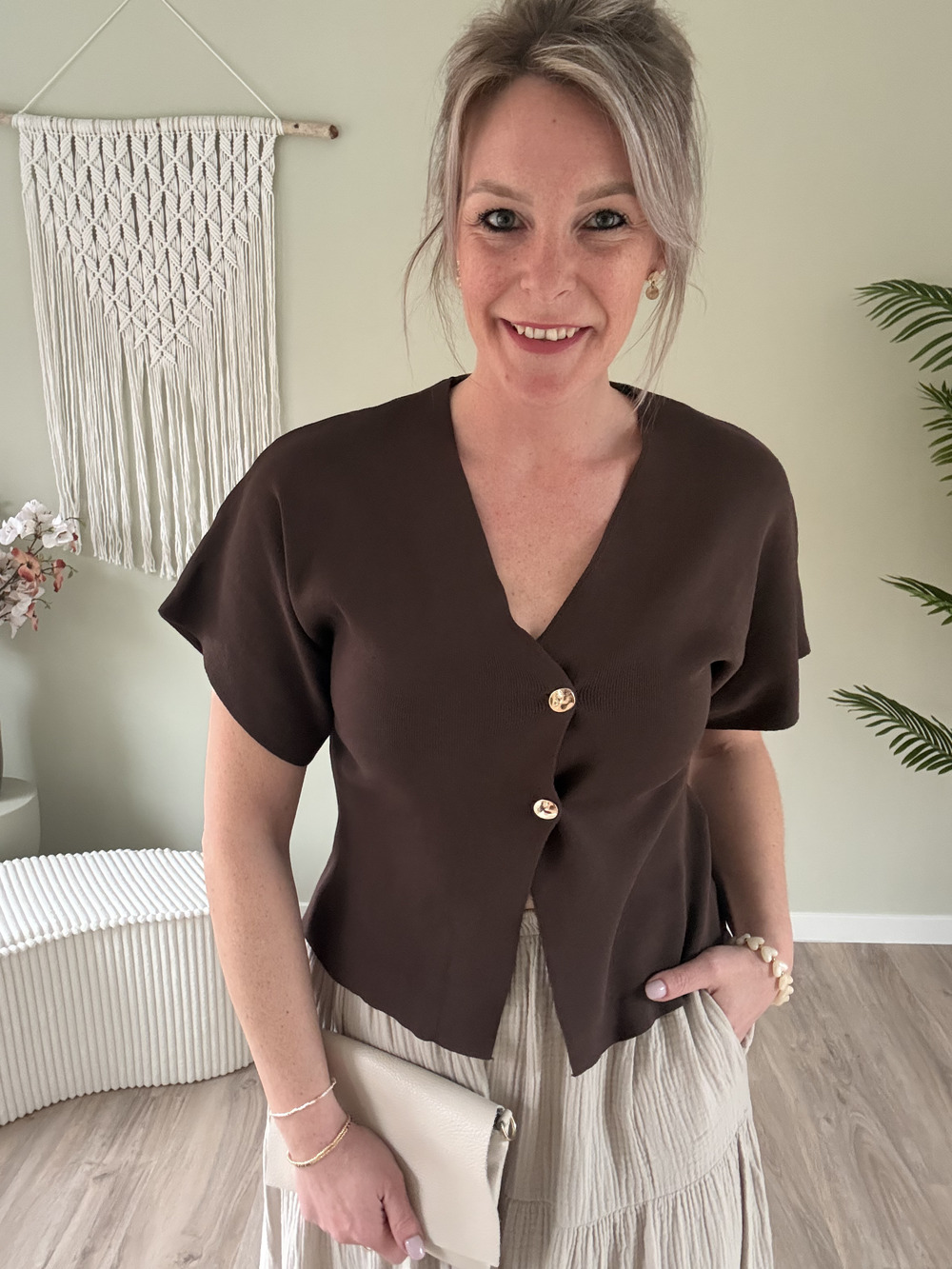 Deze mooie top komt het best tot zijn recht wanneer je hem dicht draagt. De top heeft een asymmetrische pasvorm in het midden, waardoor hij ook heel chique oogt. Deze top kan dus ook heel goed naar een feestje gecombineerd met je favoriete pantalon. Voorzien van 2 gouden knopen en een wijde mouw. Verkrijgbaar in de maten SM en ML, valt iets kleiner.