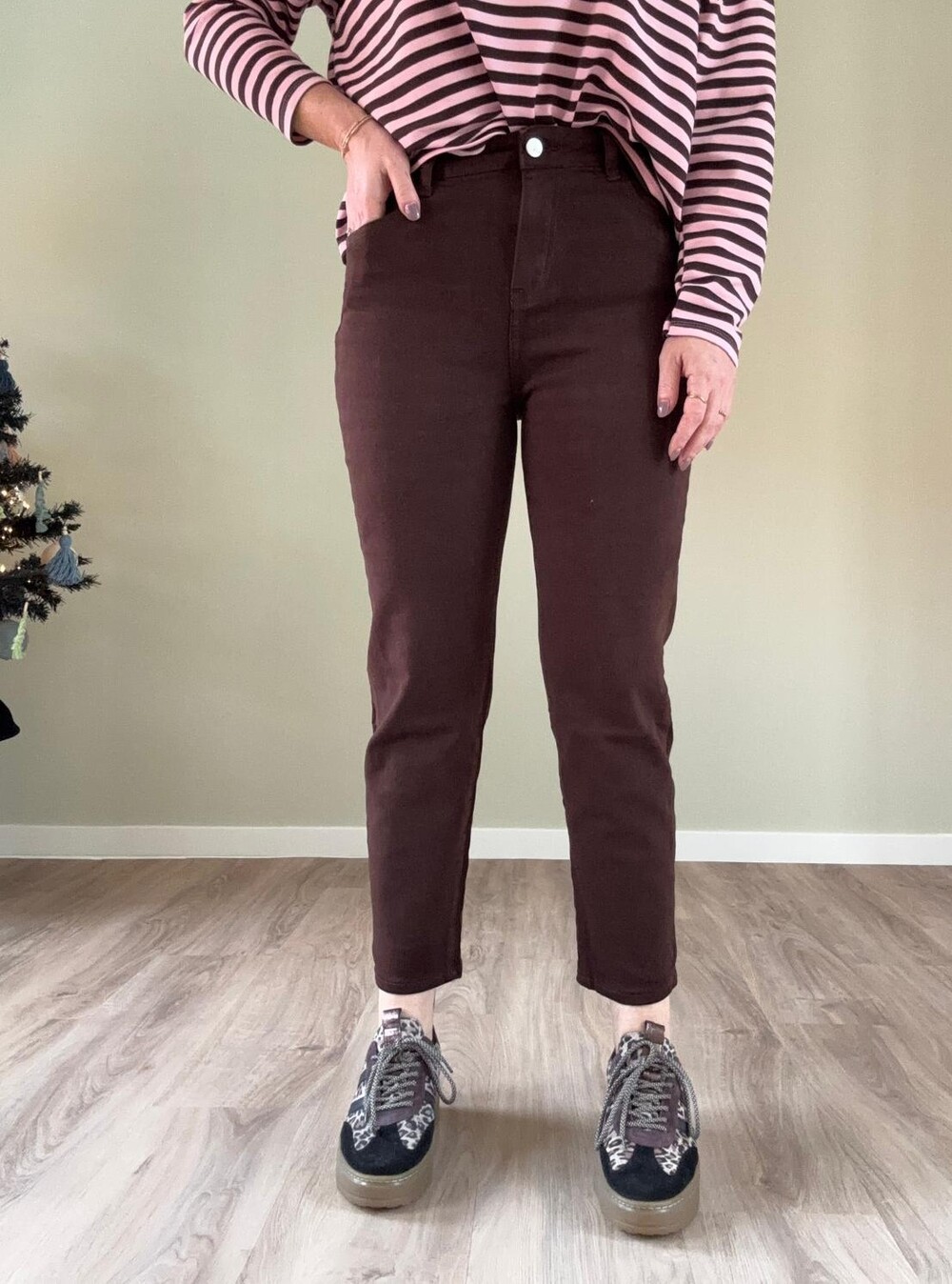 De MOM-jeans met heel veel stretch in de trendkleur choco! De jeans is gemaakt van een soepele en zachte stof waardoor hij veel stretch bevat. Door de hoeveelheid stretch raden wij aan om een maatje kleiner te bestellen dan normaal.