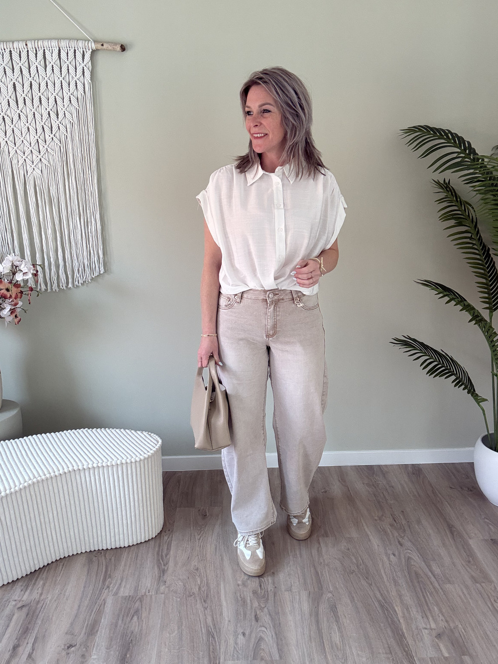 Altijd handig om te hebben een basic blousje in je garderobe. Dit blousje is gemaakt van een linnenlook stofje en heeft een oversized pasvorm. Dit zorgt dat je hem bijvoorbeeld leuk kan stylen met een knoopje. Voorzien van omgeslagen mouwtjes en knopen in dezelfde kleur. Verkrijgbaar in de maatjes SM en LxL
