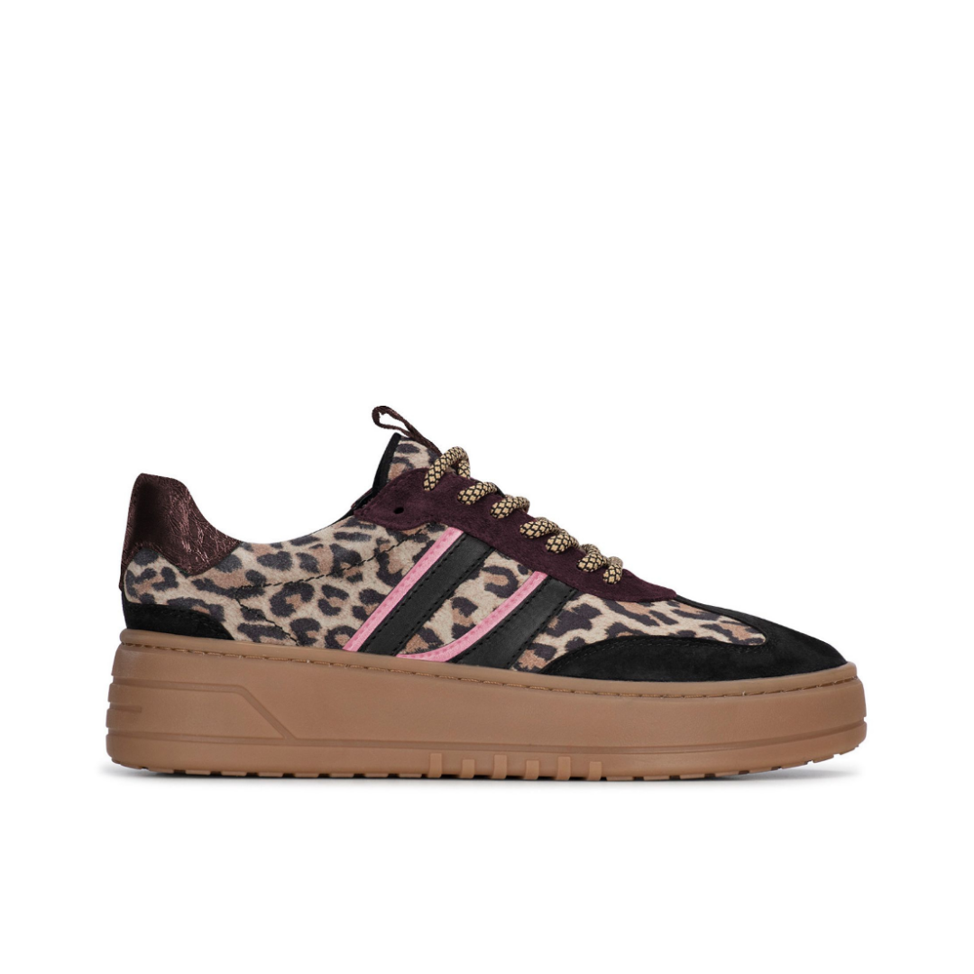 Deze panterprint leren sneakers voor dames zijn een echte statement piece! Het mooie leer met een speelse dierenprint en bordeaux accenten geeft een unieke en trendy uitstraling. De verhoogde rubberen zool zorgt voor extra comfort en een sportieve look. Dankzij de klassieke vetersluiting en het modieuze design zijn deze sneakers perfect te combineren met zowel casual als chique outfits.