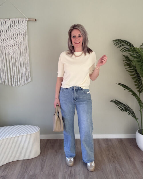 €29,95Dit fijn gebreid shirt is ideaal voor elke gezellige lente-outfit. Makkelijk te combineren onder een blazer of vest, maar ook super leuk met een kanten top eronder. Het shirt is gemaakt van een zacht gebreid stofje en fijne pasvorm. Onesize te dragen t/m maat 42.