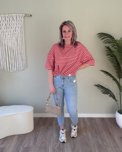€29,95Heerlijke basic shirt met een streeppatroon in 2 fijne kleurtjes. Het shirt is gemaakt van viscose, een dikkere t-shirt stof en heeft een kortere fit dan het doorsnee shirt. Hierdoor is dit shirt ideaal op je high-waist jeans, pantalon of je korte broek in de zomer.