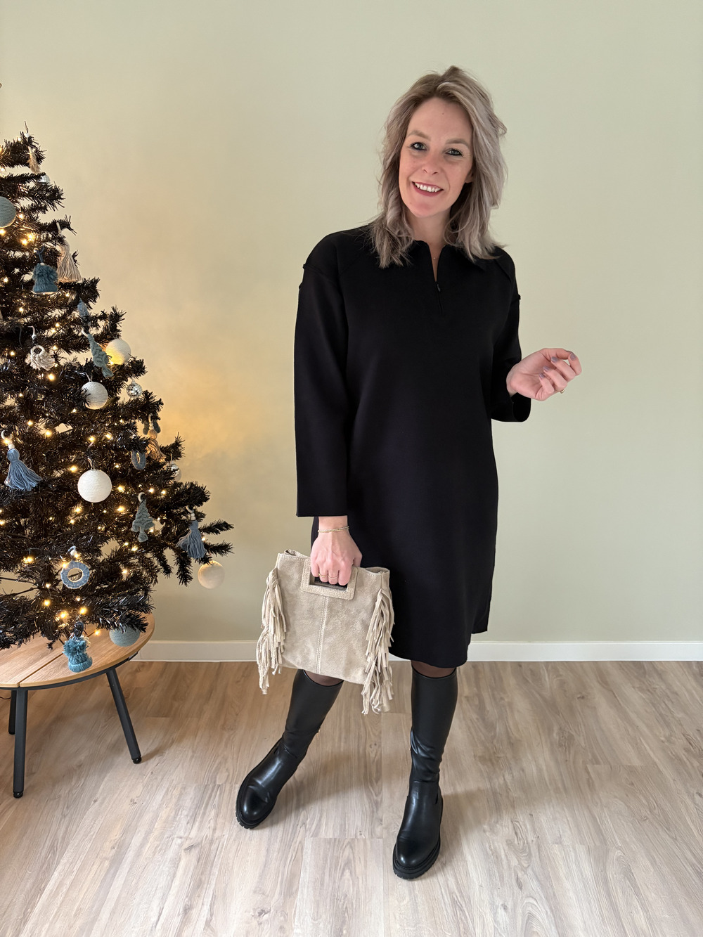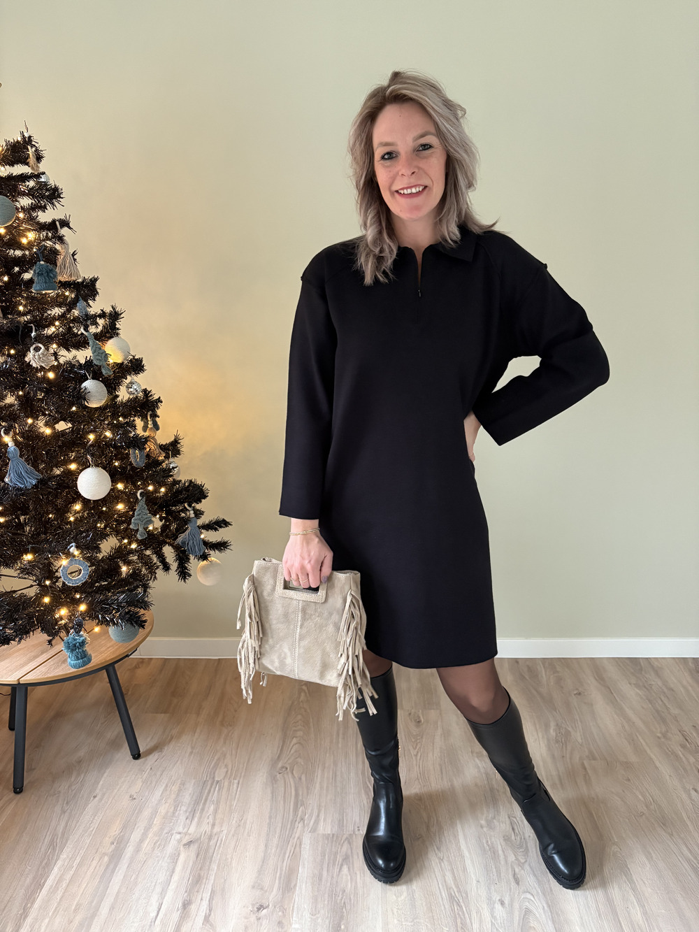 Fijne en comfortabele jurk gemaakt van een dikke en degelijke stof waardoor hij heel chique draagt. Voorzien van kraag en rits om een v-hals te creëren. Combineer hem met je favo-boots en ready to go.