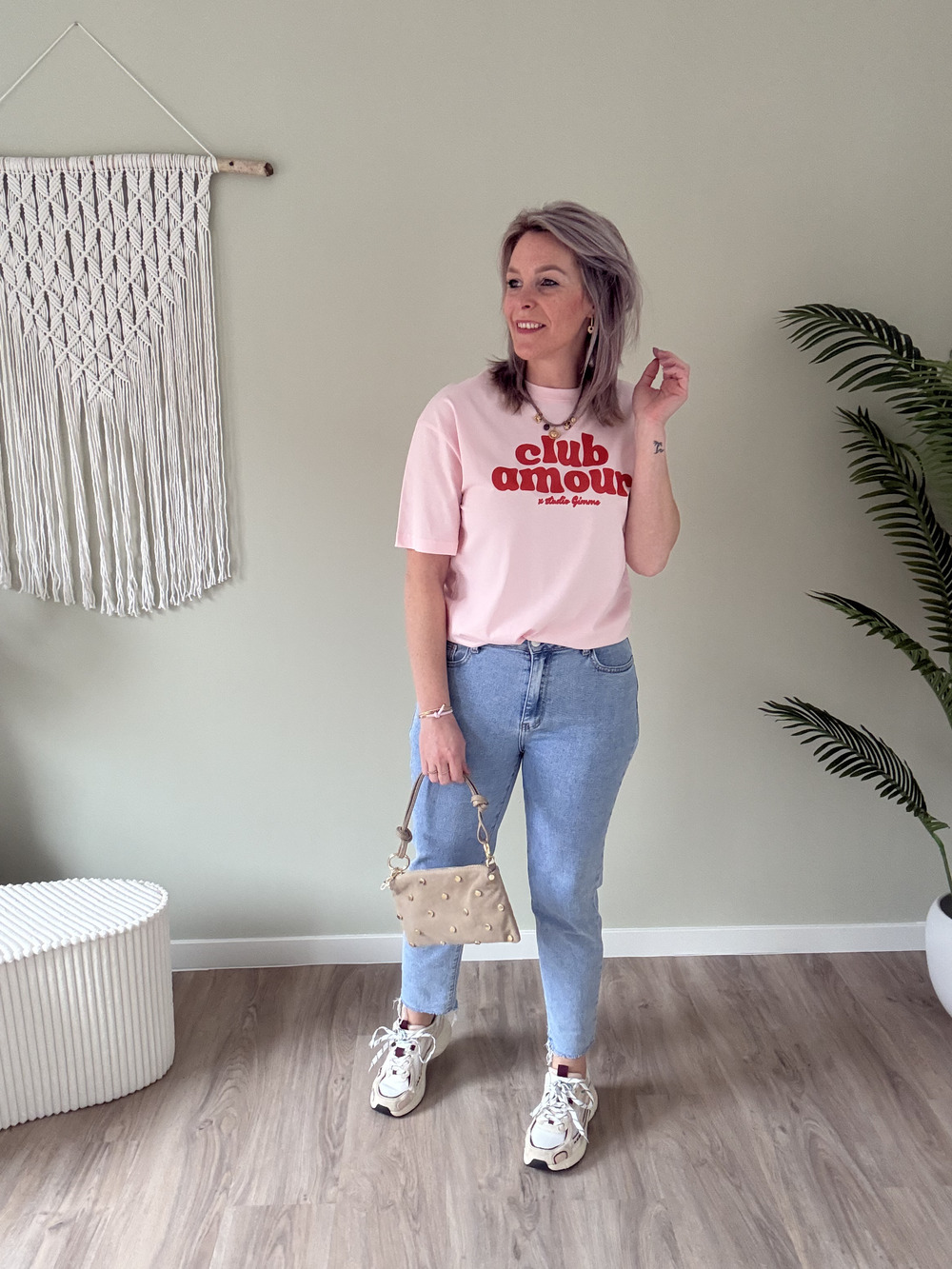 Hoe fantastisch is dit nieuwe shirt! De kleurencombi van roze en rood was al een tijdje favoriet, maar nu komen ze samen in een shirt. Het shirt heeft een opdruk aan de voorkant: leuk! Het shirt is gemaakt van katoen waardoor hij mooi draagt en voorzien van iets langere mouwen (handig!). Het shirt heeft een oversized lookje, houdt hier rekening mee. Verkrijgbaar in de maten S t/m L