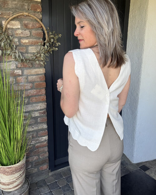 €29,95Heel iets anders dan de doorsnee blouse of top. Maar hoe leuk is deze top gemaakt van linnen? Aan de voorkant elegant en vrouwelijk, aan de achterkant een mooie uitsnede en voorzien van 2 sluitknopen. De knopen zitten rond de bh-band waardoor die volledig weg valt.