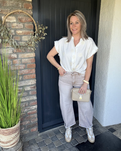 €29,95Een fijn zomers blousje om je garderobe mee aan te vullen. Dit blousje is gemaakt van een linnenlook stofje, voorzien van kleine broderie details en heeft een oversized pasvorm. Wil je hem niet oversized? Dan kun je hem bijvoorbeeld stylen met een knoopje. Voorzien van kap-mouwtjes: leuk hoor! Verkrijgbaar in de maatjes SM en ML